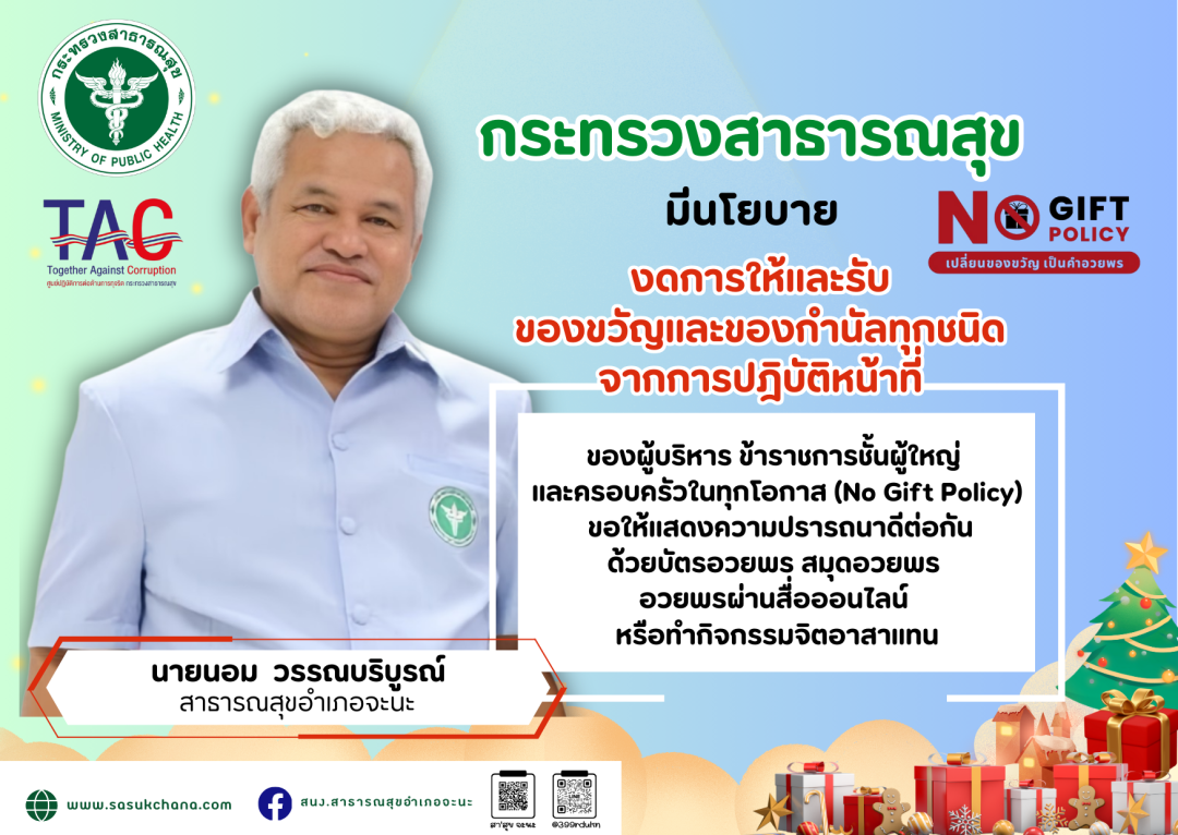 กระทรวงสาธารณสุข มีนโยบาย No Gift Policy งดการให้และการรับของขวัญและของกำนัลทุกชนิดจากการปฏิบัติหน้าที่